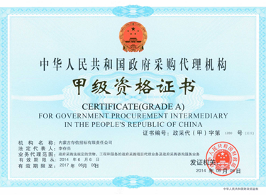 • 中華人民共和國政府采購代理機構甲級資格證書
